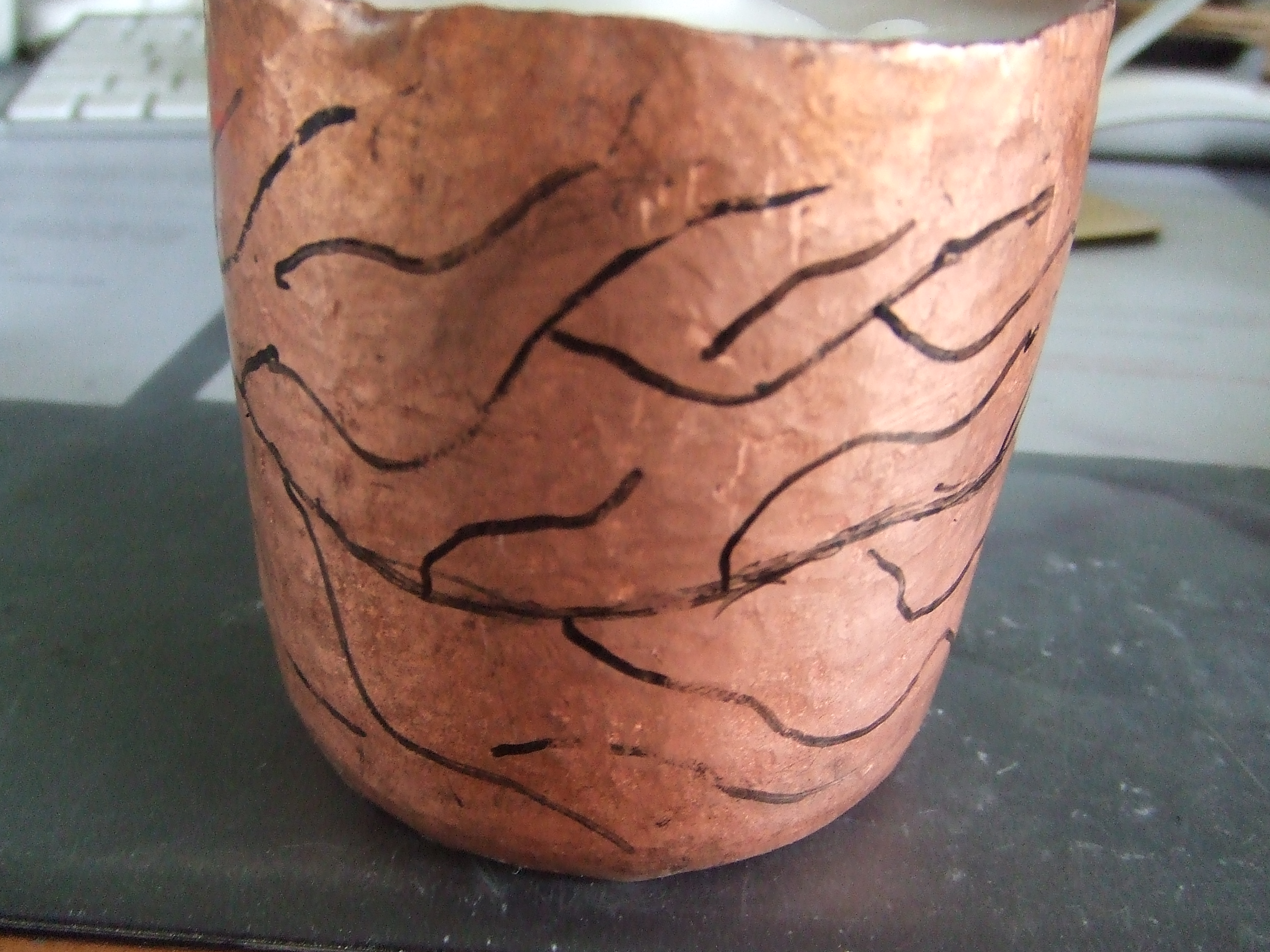 DSCF2857 Published March 17, 2013 at 2592 × 1944 in Hammer chased beaker example of air chasing with modified hammers rough design The start of the design, I use dry wipe markers so I can change as I go with just wiping with my fingers.