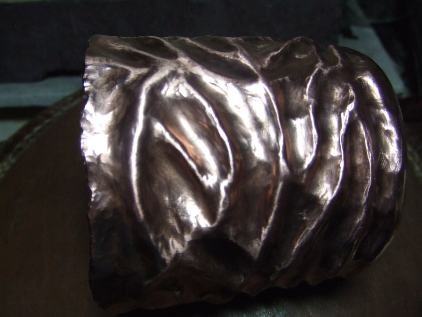 DSCF2876 Published March 17, 2013 at 2592 × 1944 in Hammer chased beaker example of air chasing with modified hammers different view close up Polished ‘valleys’ and scotchbrite raised ridges.