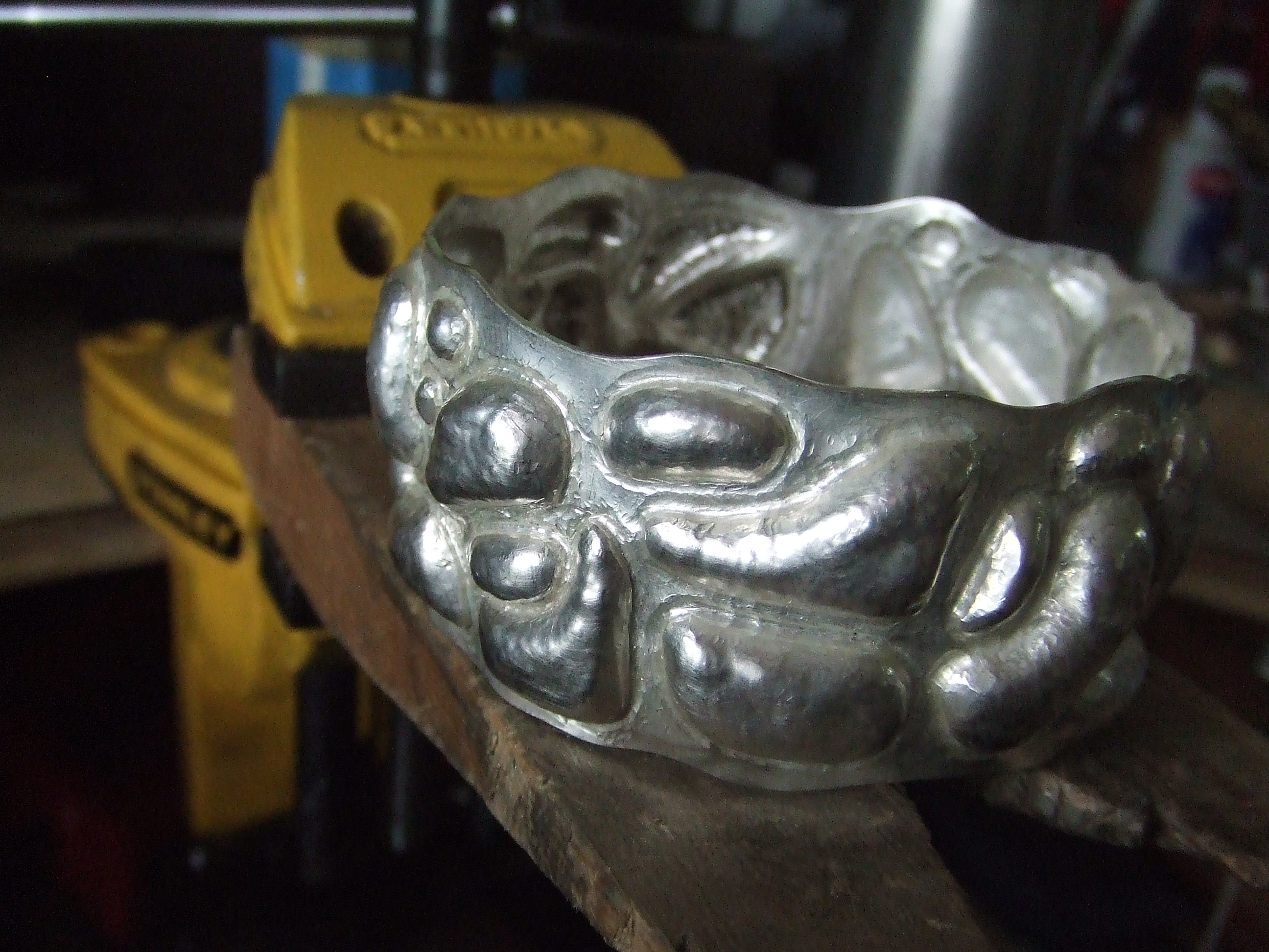 DSCF2599 Published April 21, 2013 at 2592 × 1944 in Repousse and Chased cuff bracelet, a journey from copper to silver The last undercutting before texture and patternation added. Note the ‘moats’ surrounding each stone, please read text.