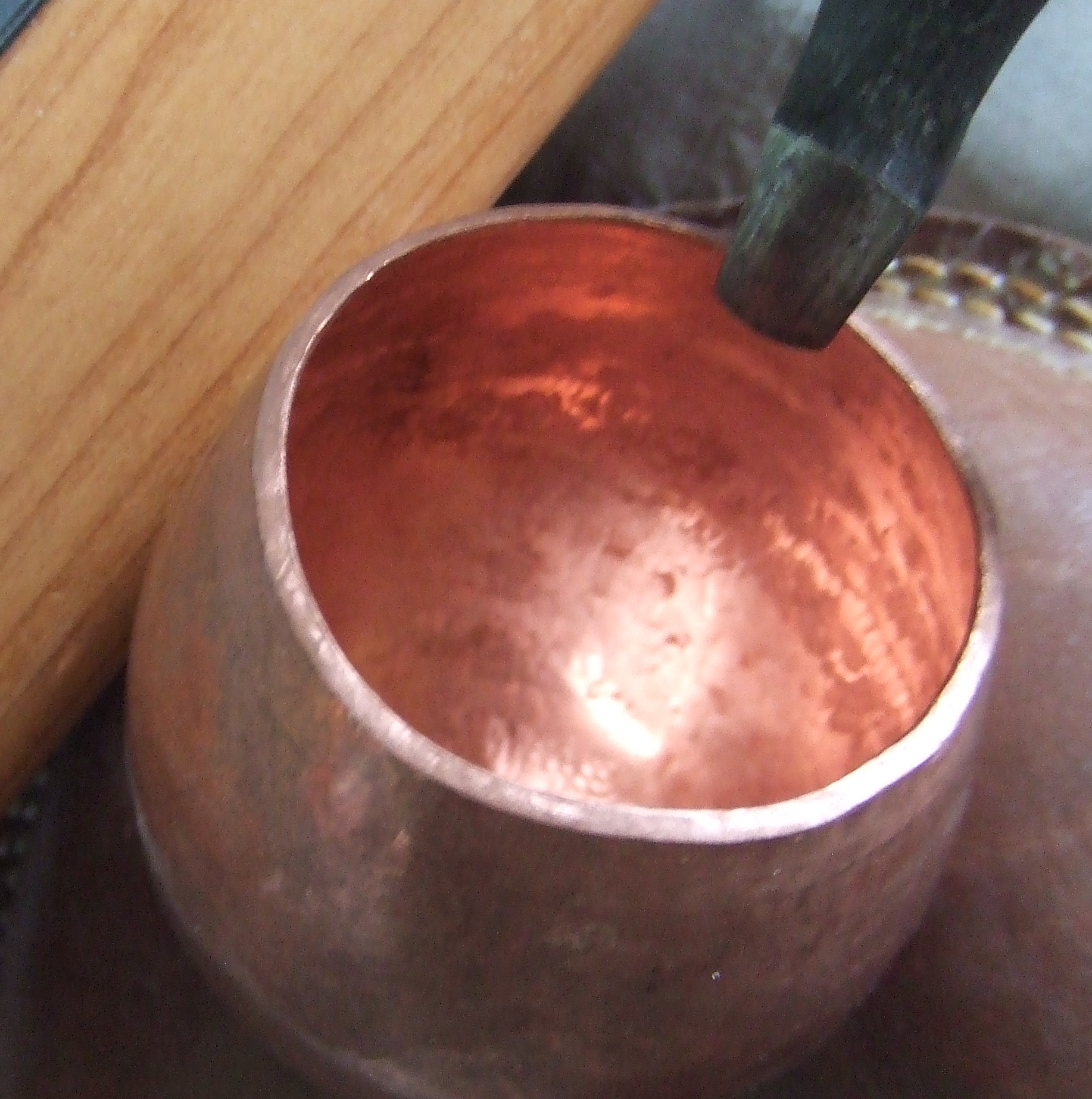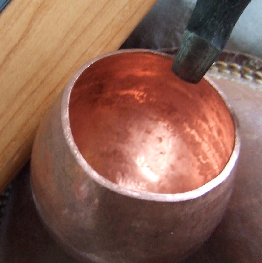 DSCF2903 Published June 15, 2013 at 1834 × 1846 in Raised silver bowl, calking for a thickened edge I forgot to take pictures of the Britannia silver bowl being calked. This copper one clearly shows the process, hammer blow square on.