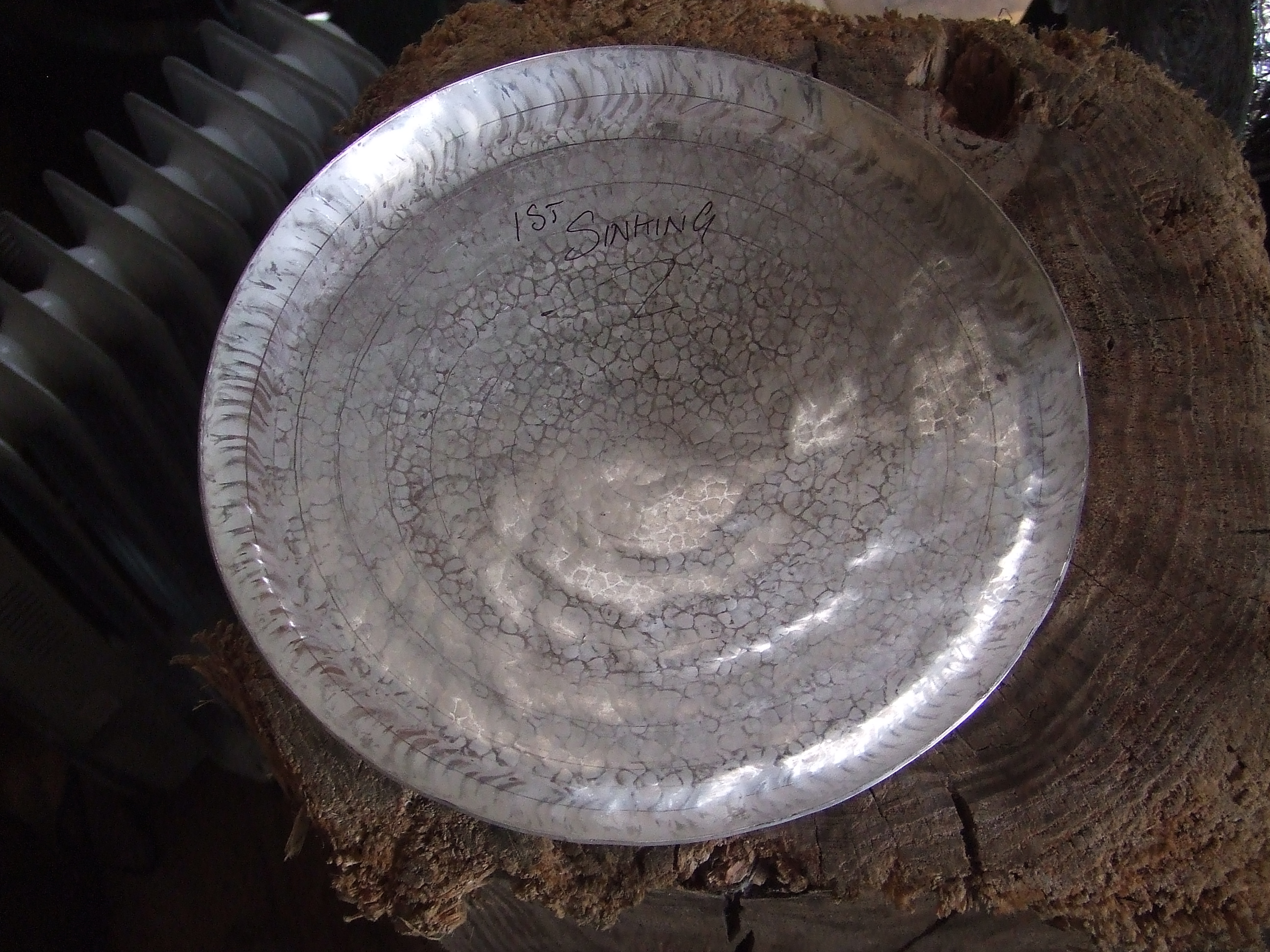 DSCF3055 Published July 2, 2013 at 2592 × 1944 in Sinking Britannia silver bowl, preparing for raising First round from outside to middle with steel blocking hammer