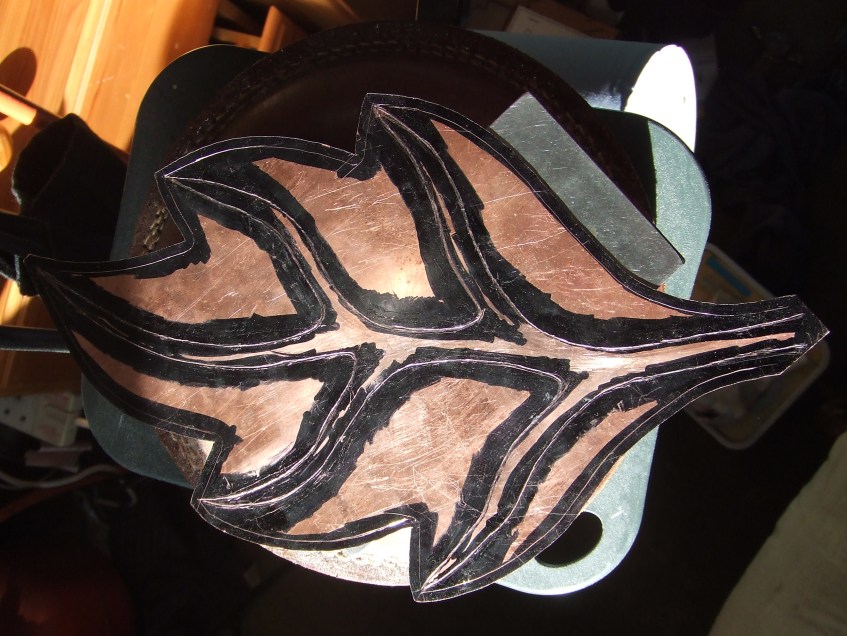 DSCF3308 Published December 6, 2013 at 2592 × 1944 in Repousse´ and chased flame patinated copper sunk leaf bowl permanent marker used to trace outline, scratched in. See how clear the scratched line is against the black, much easier to chase this line.