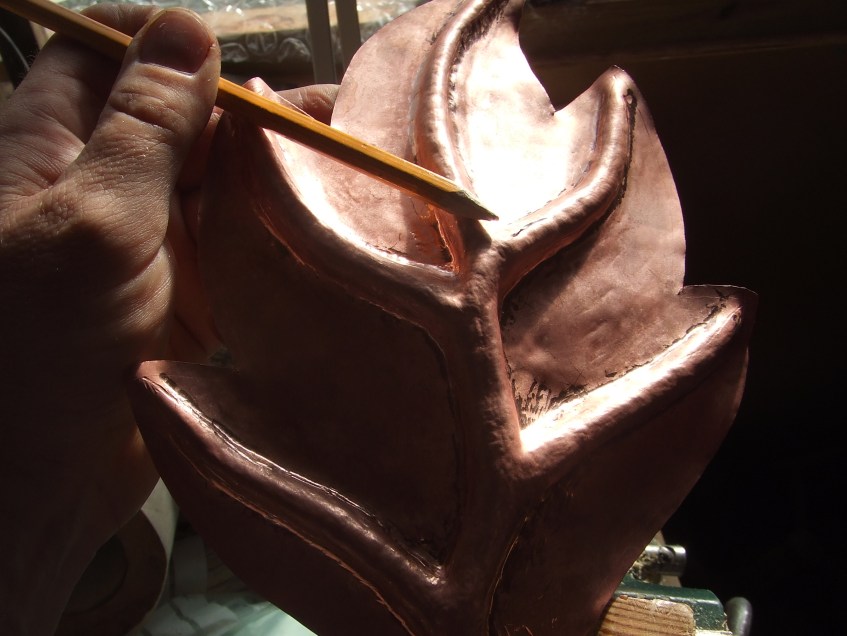 DSCF3314 Published December 6, 2013 at 2592 × 1944 in Repousse´ and chased flame patinated copper sunk leaf bowl too much too soon, what a twit.