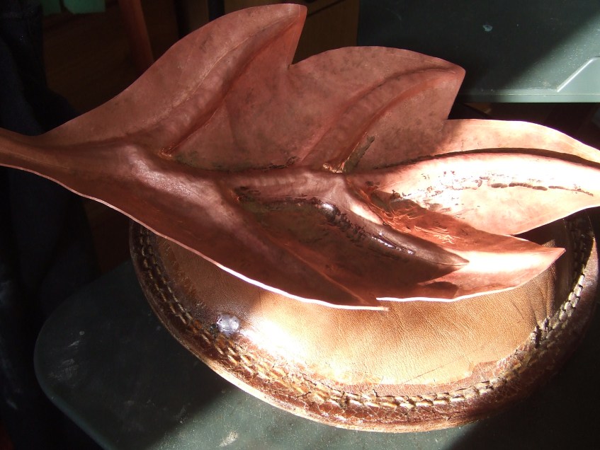 DSCF3316 Published December 6, 2013 at 2592 × 1944 in Repousse´ and chased flame patinated copper sunk leaf bowl sinking into a sandbag to create the curl.