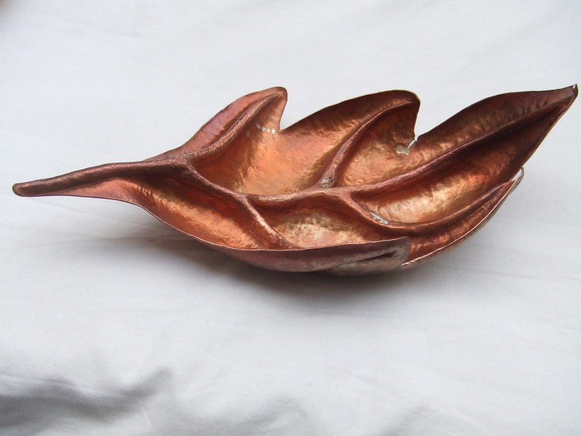 DSCF3322 Published December 6, 2013 at 2592 × 1944 in Repousse´ and chased flame patinated copper sunk leaf bowl completed copper leaf