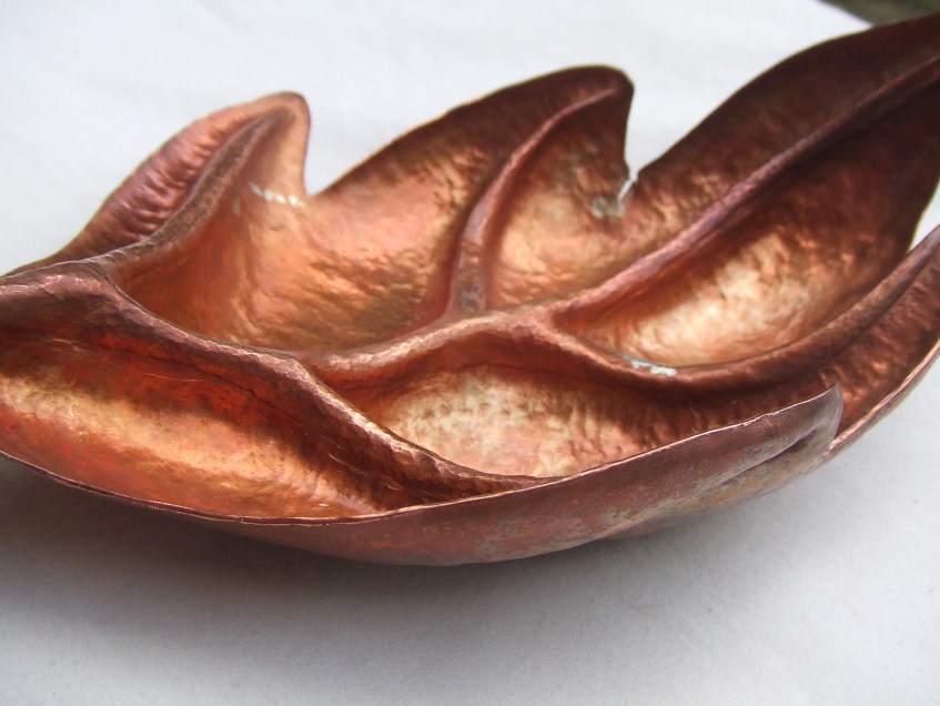 DSCF3333 Published December 6, 2013 at 2592 × 1944 in Repousse´ and chased flame patinated copper sunk leaf bowl some hammered, some punched