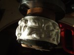 Here lies another challenge with a closed form, if you recall it is best to keep the chasing and repousse punches near vertical for them to work at their best. Now you will have to work from either opening of the bracelet. Shown here on my plaster scene, I try to use this as much as possible as the pitch stage is time consuming to set up and messy to clean up.