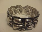 The cutting and finishing of the wavy pattern was done with a jewellers fret saw, files and sanded to acceptable standards before returning to the pitch for final texturing. After putting on the pitch it was left to cool so as to create a hard stake like effect that would support the shape, preventing distortion whilst the texture was applied with liners and planishing punches.