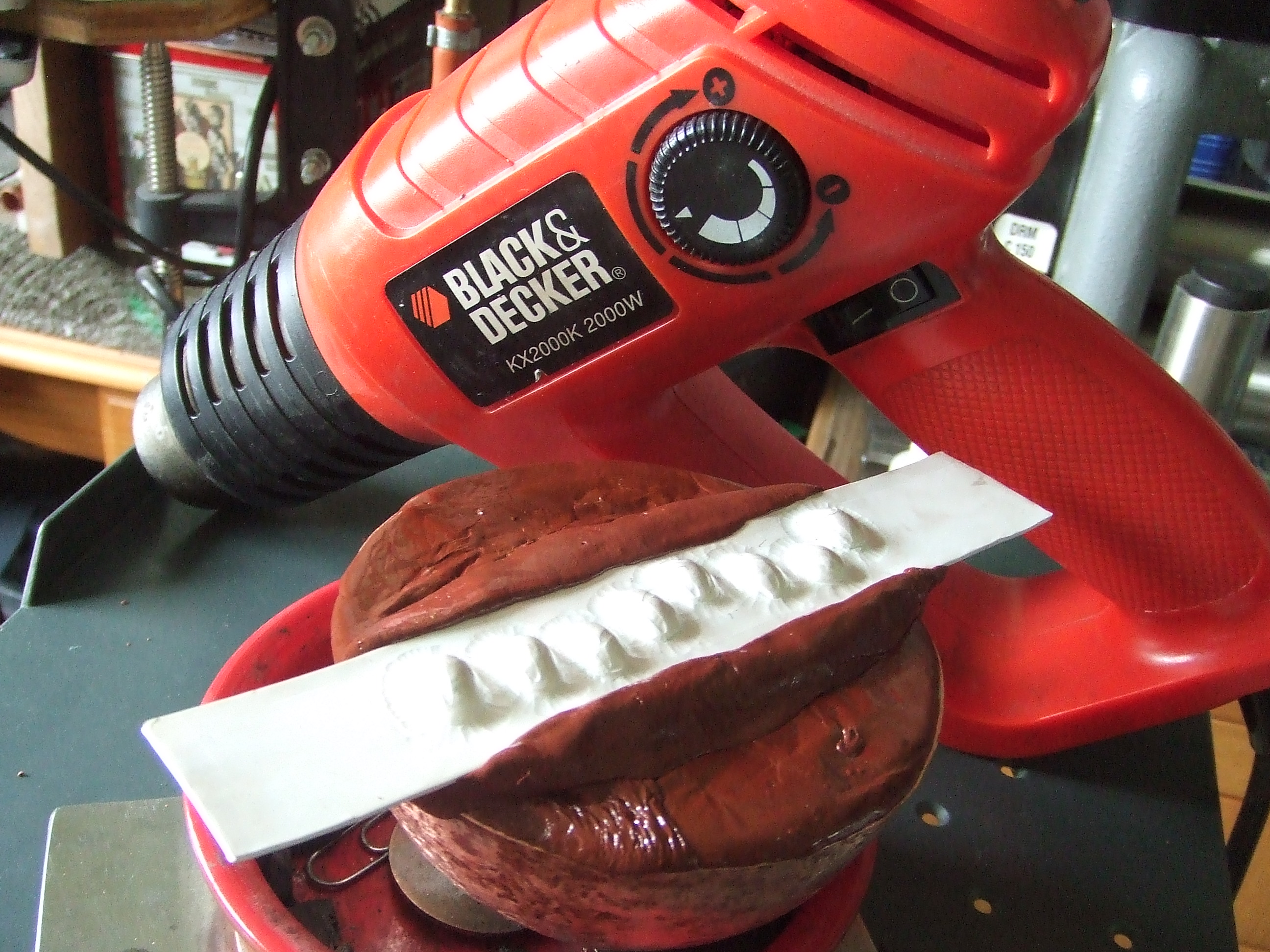 She very kindly passed on a tip she picked up whilst there. I show, in the first picture, a heat gun that I have always used for softening my pitch. I find the thought of playing a flame over it and all the associated soot, not good. My Dad is a heating engineer and he has a supper dooper programmable digital heat gun used to check out thermostats. I couldn’t afford one of those, but I got the idea this one. Its great for the job and has a variable heat setting that I find very controllable. Patricia also says DB uses such a gun for annealing!! How cool is that. I must confess I haven’t tried it yet, I will though. Could it be a better way, less risk of overheating and firestain. I will let you know, Thank you again Partricia.