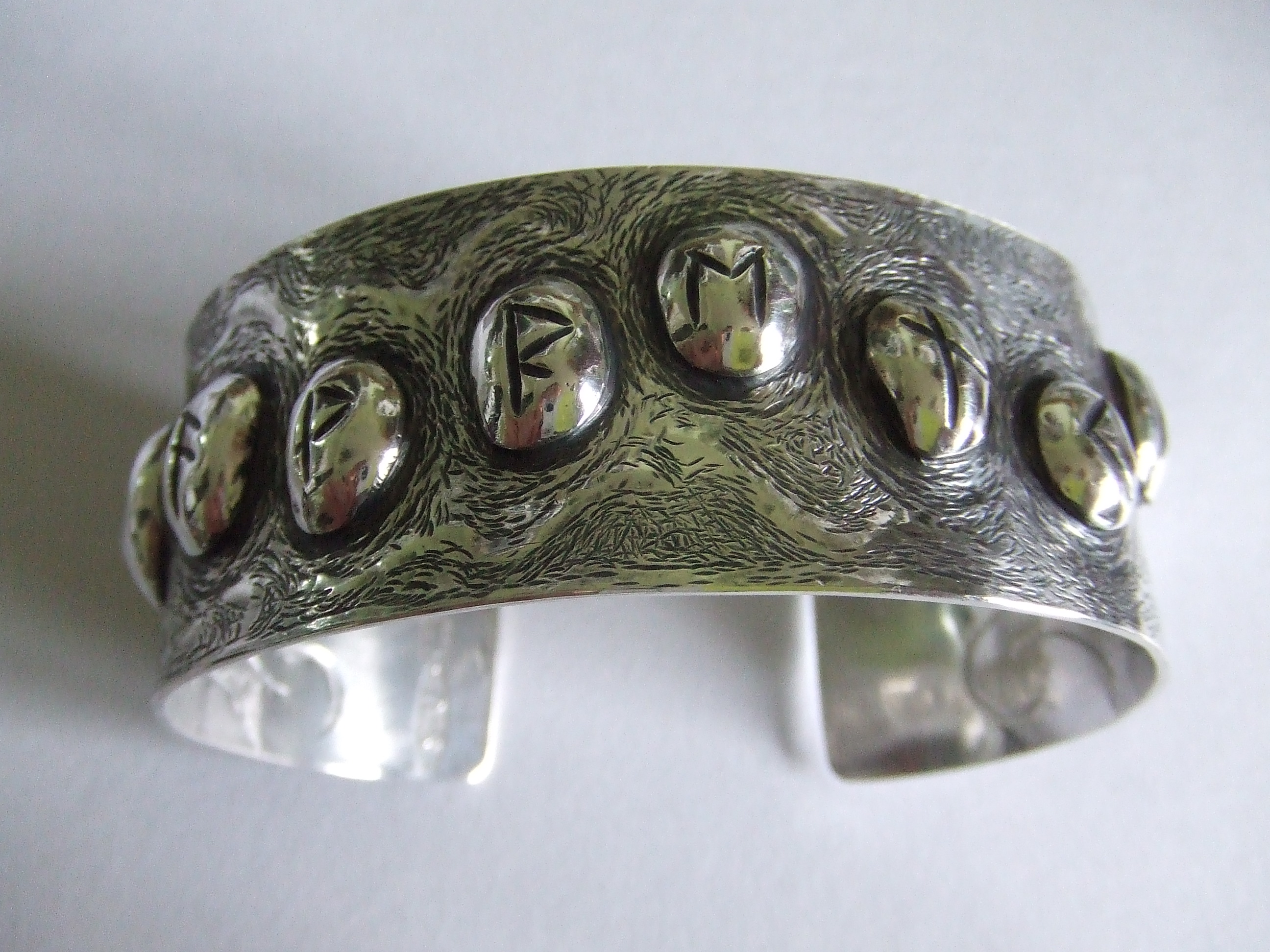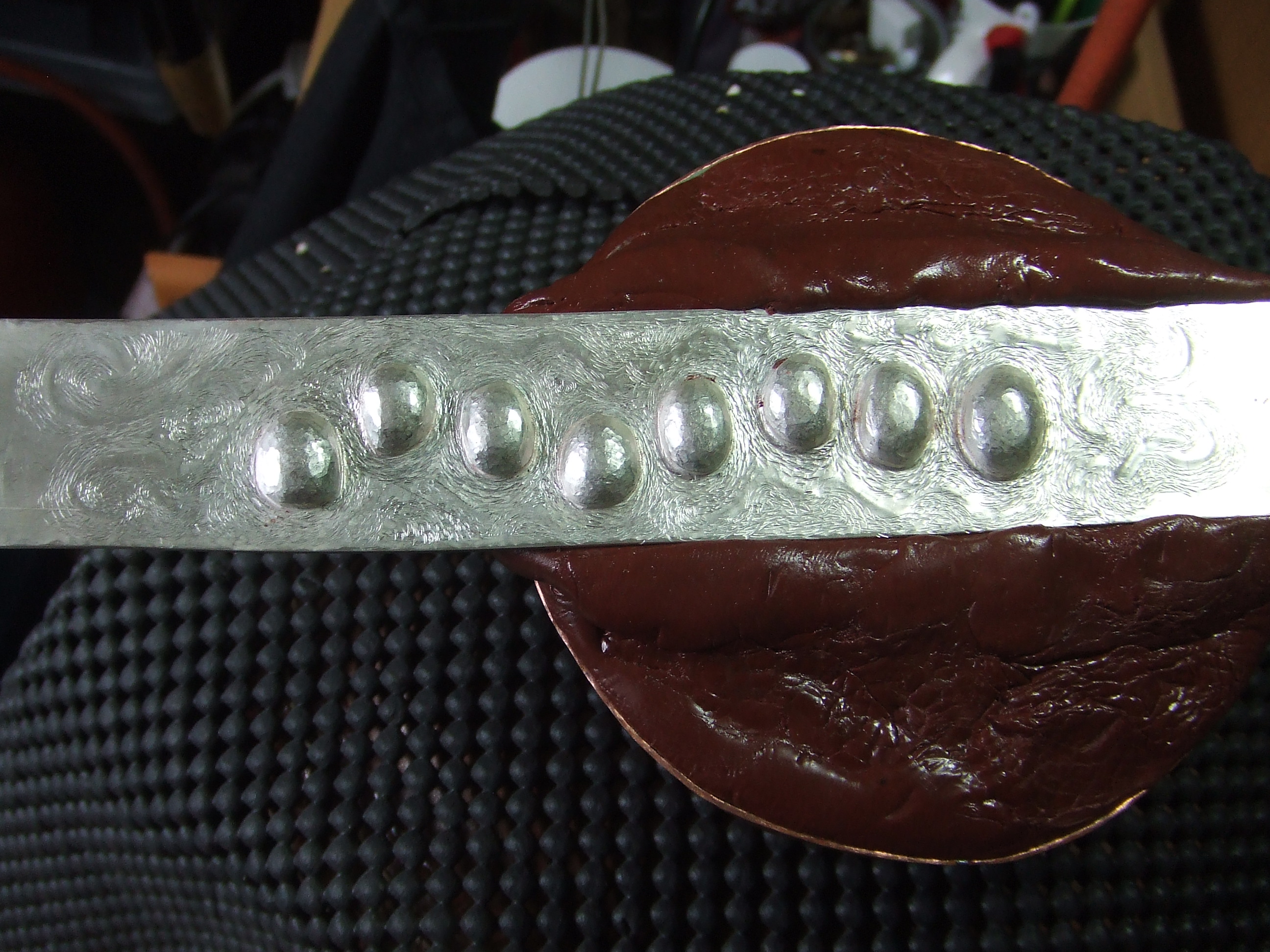 After all the water flowing decoration was applied I planished each rune as best as possible with planishing punches. From the pictures of runes I have seen, many appear to be smooth and shining. Not my normal approach, I much prefer the planishing marks, however for the effect I was looking to create, polishing was next.