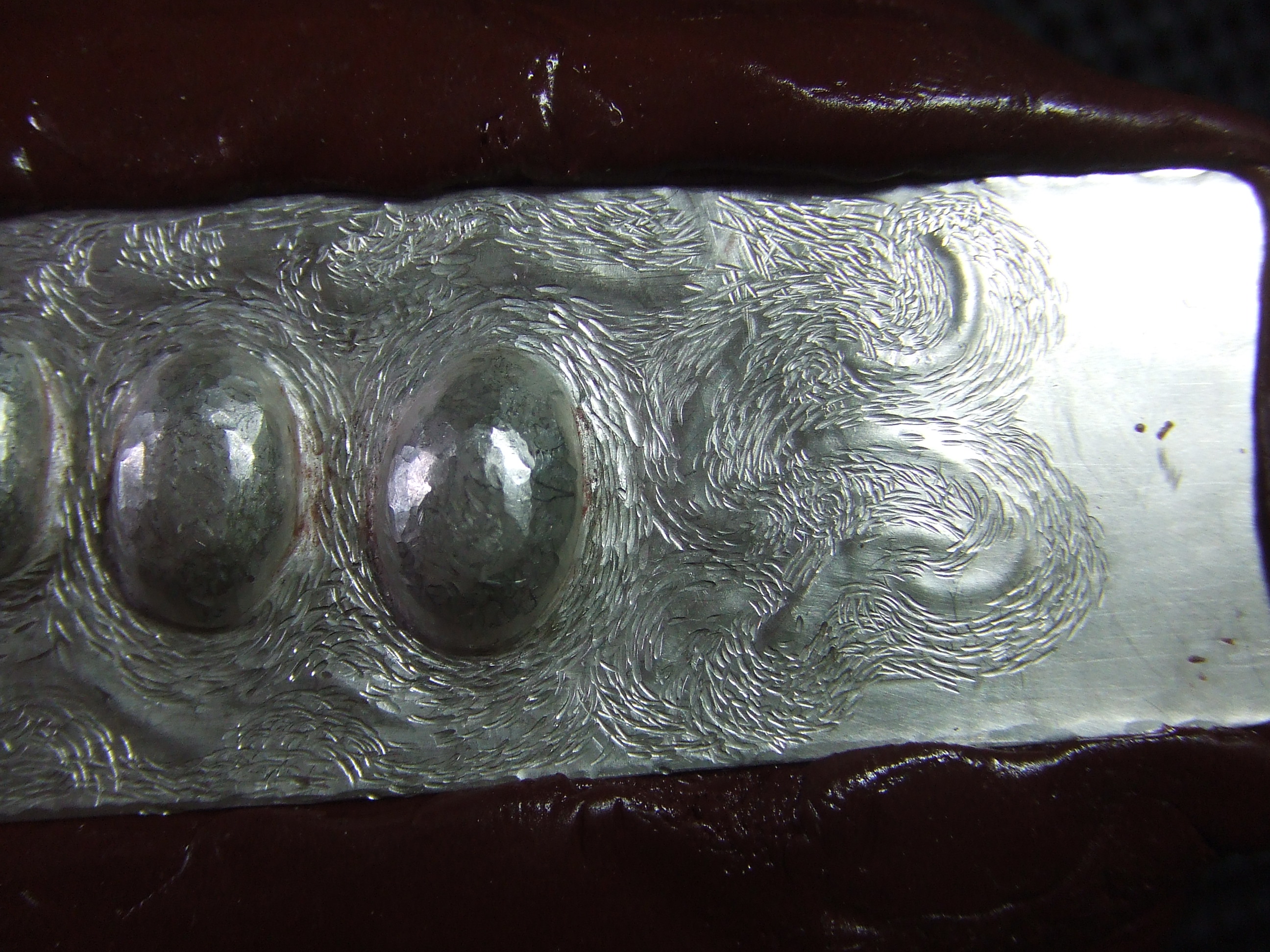 Not shown, look at the slightly raised areas made by turning the piece over in the pitch to repousse´ small water eddie type effect.