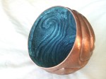 The cost of a new pitch bowl, combined with the postal charges – they are heavy cast iron after all – was, again prohibitive. The solution was to turn to my trusty supply of copper hot water tanks, sink a spherical bowl and use that. At approx 0.6mm thick, the copper was way too light on its own. Also the amount of pitch I ordered would not fill the 10cm bowl I made to accommodate it. A solution to kill two birds, as it were, was to 3\4 fill the bowl with some scrap lead I had given to me. The pictures show the block in mole grips, held over the bowl. Using a propane torch I dripped the molten lead into the bowl.