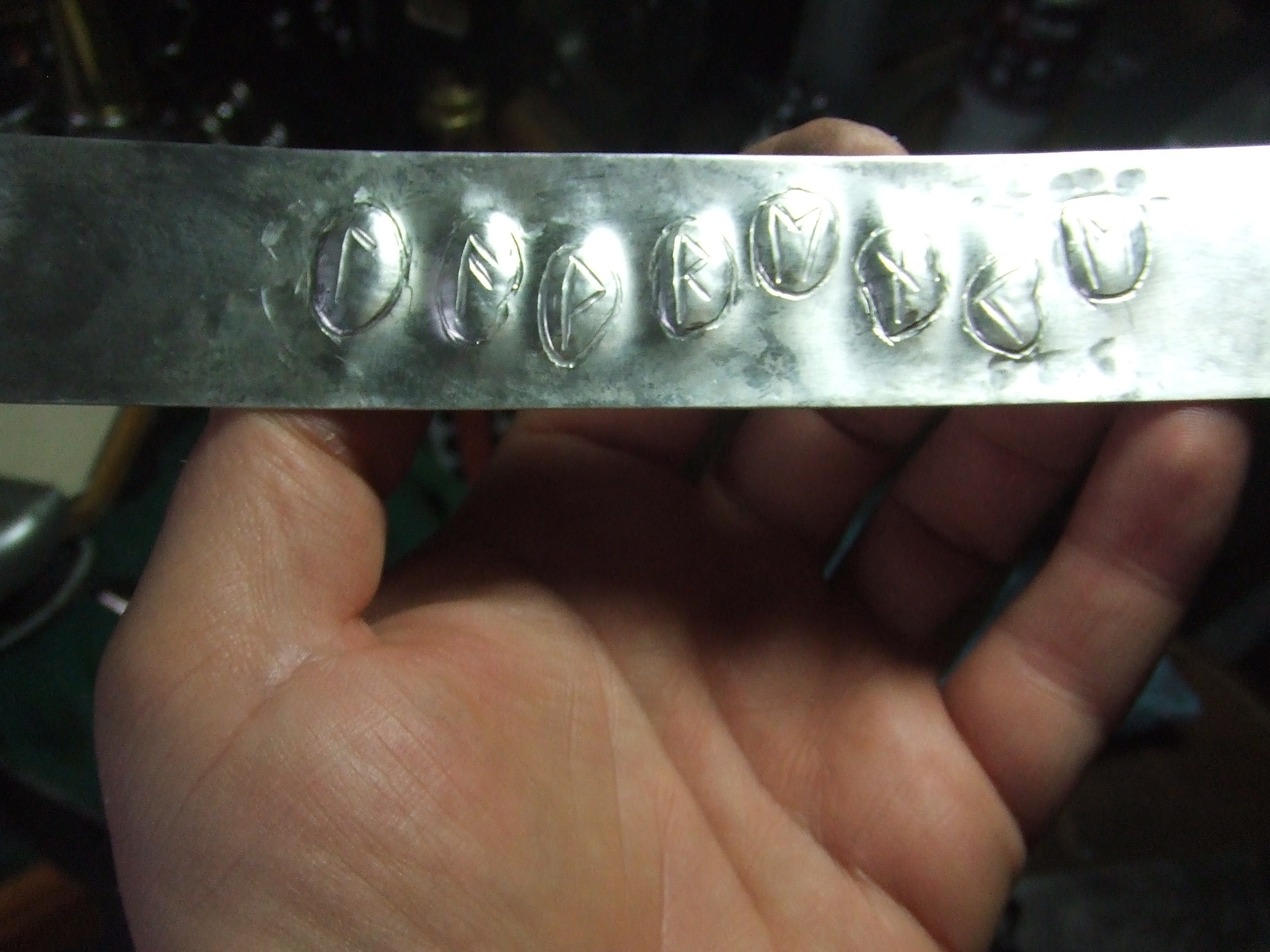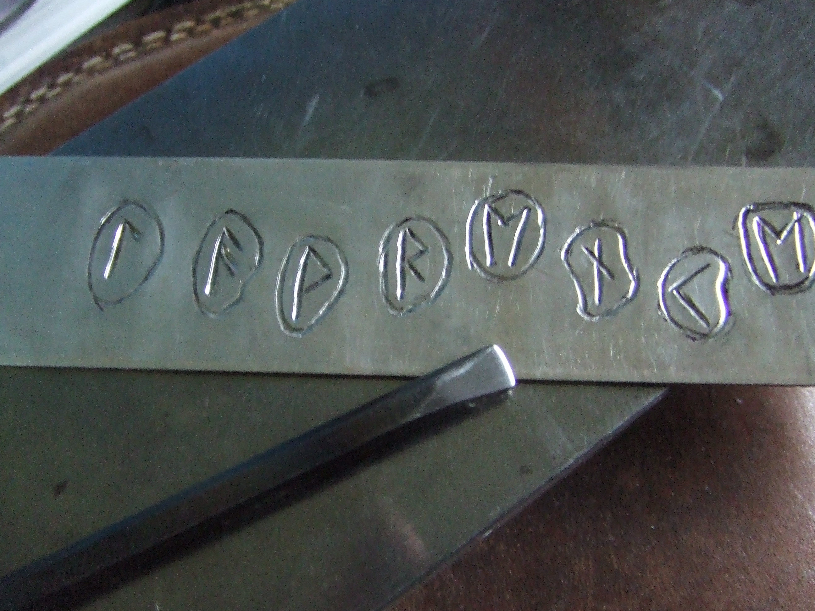 The underside after outlining the individual runes from the front, notice the clean edged as they have been encouraged back to the steel plate.