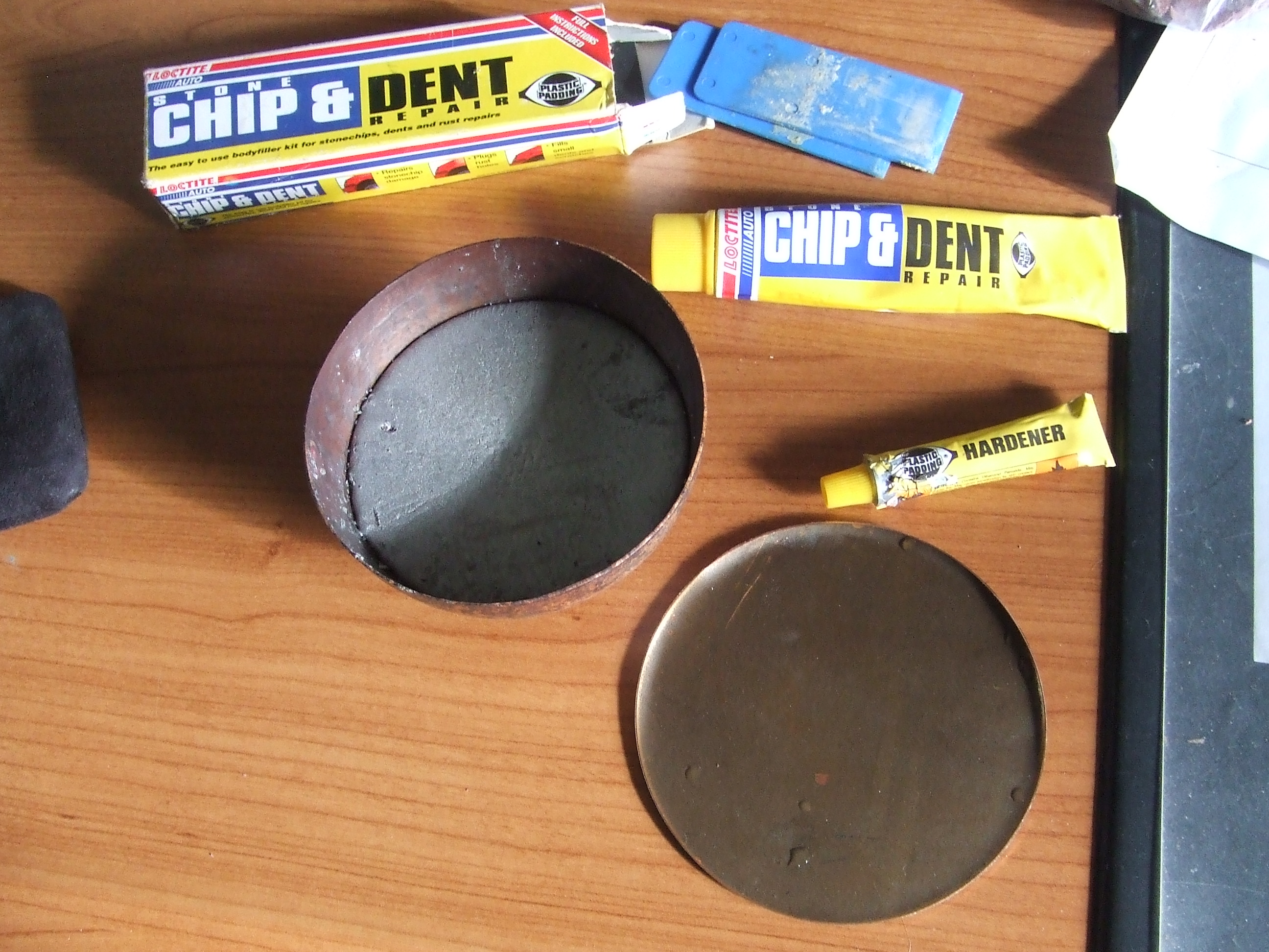 The bowl is now heavy enough to prevent it skidding about as I use it. I know the lead is not a great idea, health and safety and all that, so I decided to contain it with a disc of copper. To secure the disc I chose to use body filler as it will not get hot enough in use to cause an issue. The low melting point of the lead makes it, to my mind anyway, impossible to solder, so this was a solution. The beauty of the body filler is that it will fill the gaps, making a permanent barrier against the contamination of the pitch with lead.