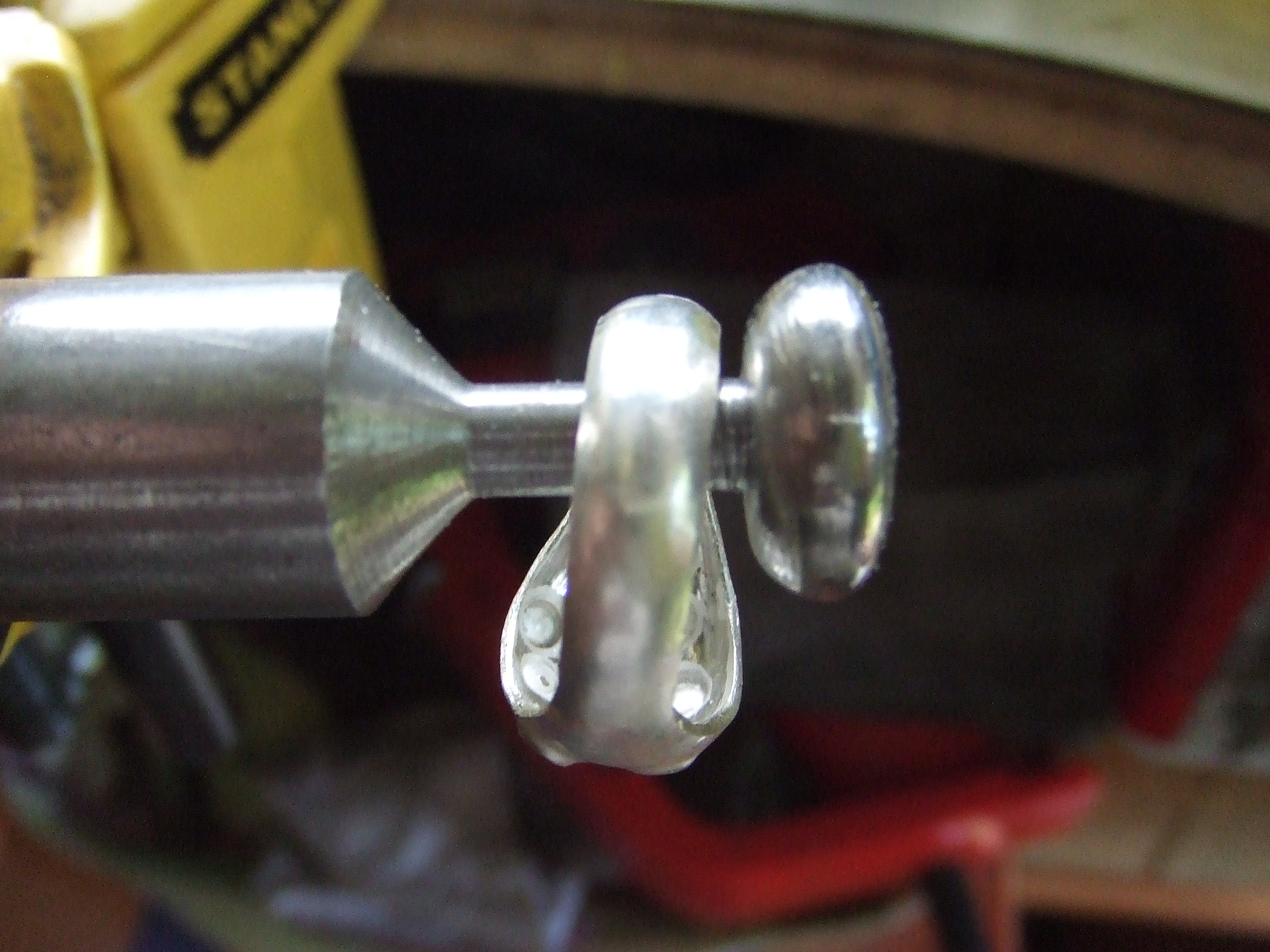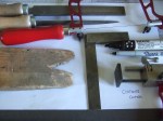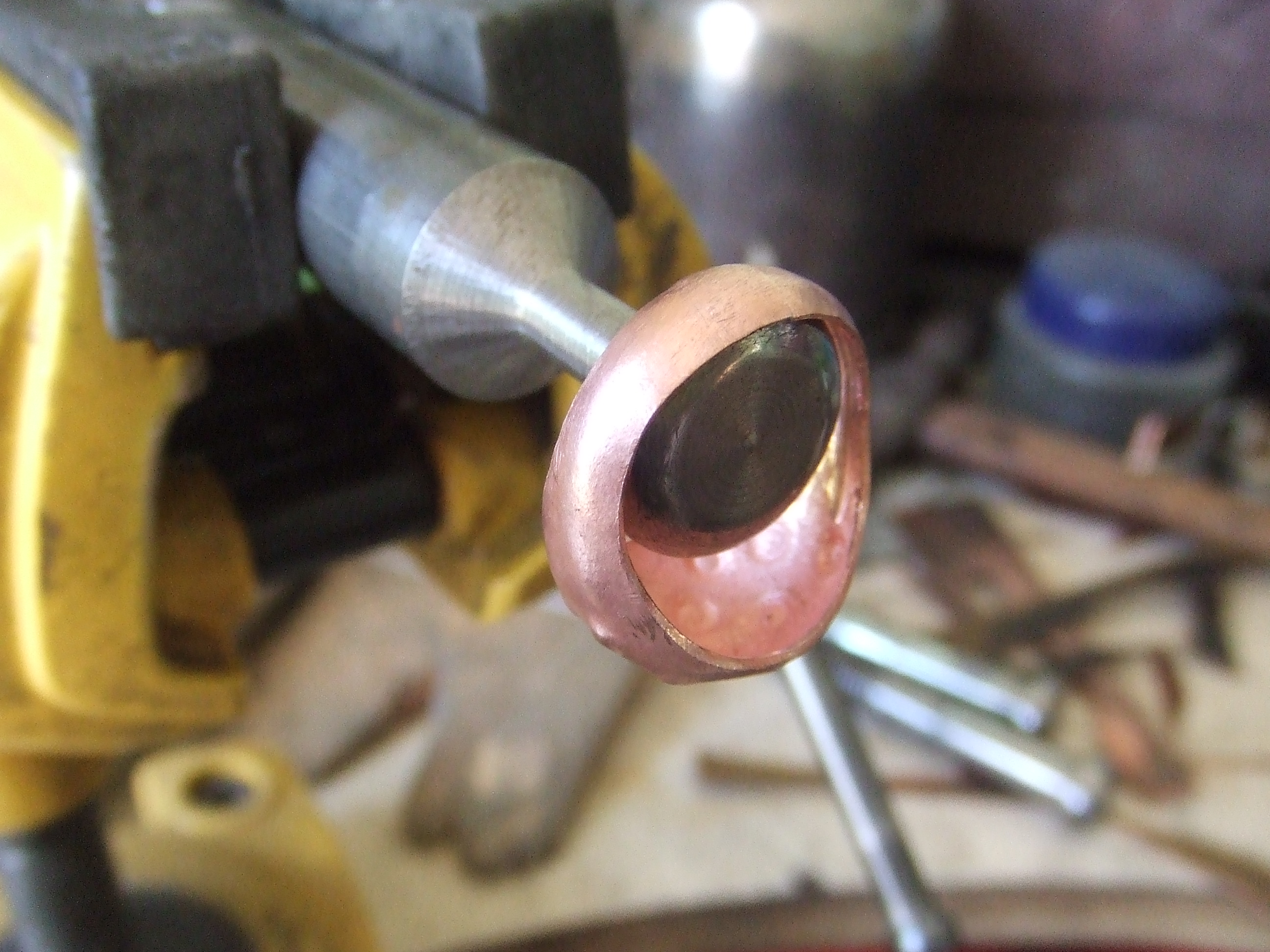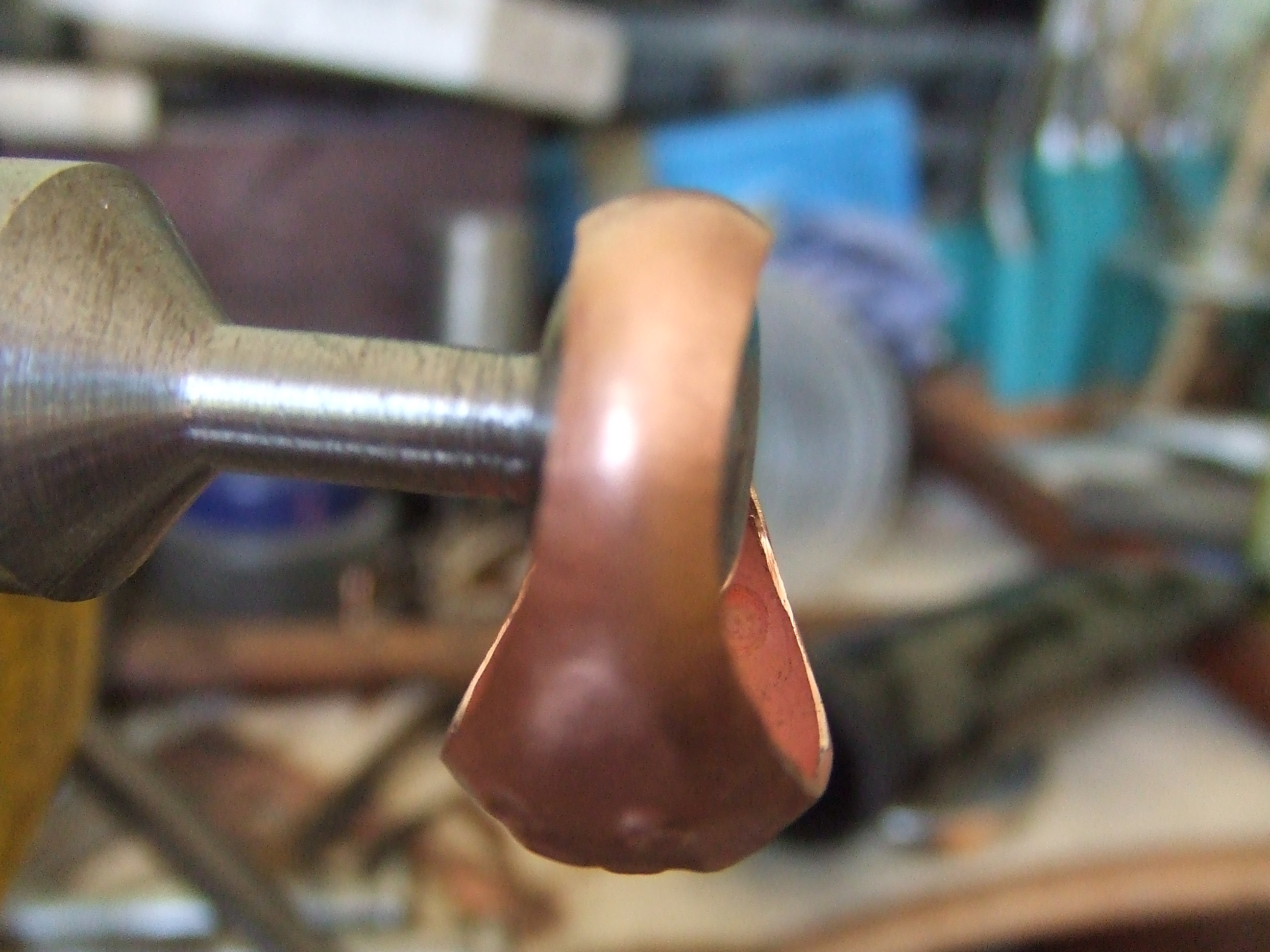 These ‘pliers’ were purchased on Ebay a while ago after I came across them in one of my second hand tool hunts. They are old pig ringing pliers. Used to attach nose rings into pigs. As you see, you have the option of two sizes. I was not strong enough to form them with my hands, resting one handle on a rubber block and tapping the other closed with a leather mallet. Fantastic and painless result, as shown. Ring forming pliers are nothing new, look on any jewellery supply site. However these are quite a bit larger than the ‘proper’ jobs. Also, who wants pig pliers, cost conscious farmers thats who. Not ‘oh its for working precious metal therefore its and arm and a leg please’ of the tool suppliers. Look up a set for yourself. These are aluminium, thats a bonus as they will be far less likely to mark your material, a danger with steel ones. Also, should you so wish, you could mirror polish them and use them for making production runs of perfect, unmarked larger jump rings ready for soldering.